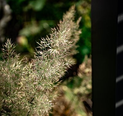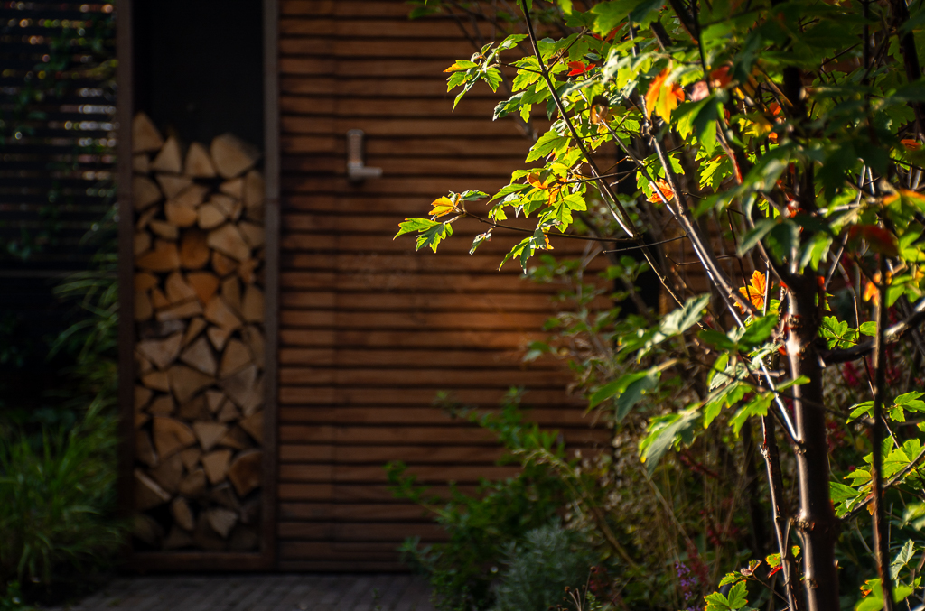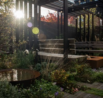 An autumnal, romantic oasis in tune with nature. A black steel pergola anchors the space where strong geometric lines juxtapose the wild planting. Visually light due to the narrow columns and beams, the structure supports a cantilevered timber bench using slated timbers to create a bold architectural aesthetic. At the centre of the seating area sits a corten steal fire pit set in a textured bed of gravel. A small pergola mirrors its grander cousin, framing the BBQ area below and the view out to the garden from the dining room table.