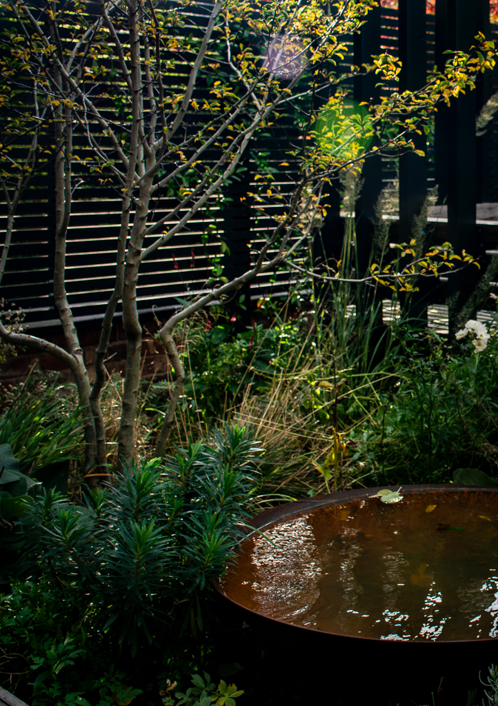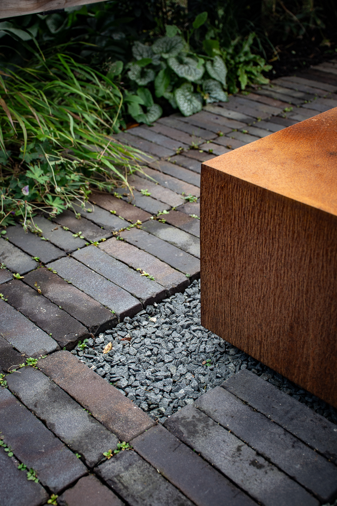 Staggered plank clay pavers laid in a modern stack bond pattern provide a low maintenance and subtle surface. Sleek hardwood decking steps provide easy access into the rear of the property and create warmth and texture. A water bowl reflects the above foliage and encourages wildlife into the garden. A timber slatted screen in black sits above the wall and provides a subtle foil for the rest of the garden whilst a bespoke timber shed and Corten wood store also doubles as a living wall on the side elevation.