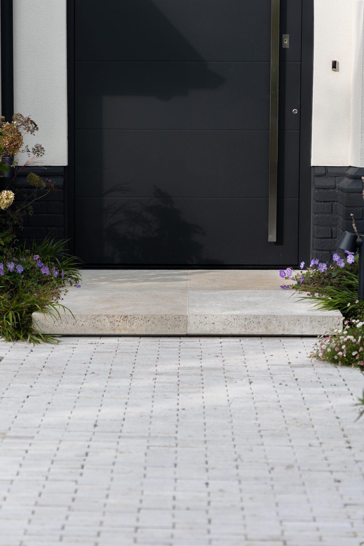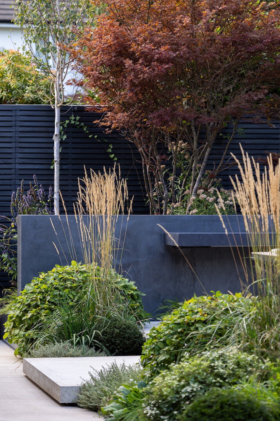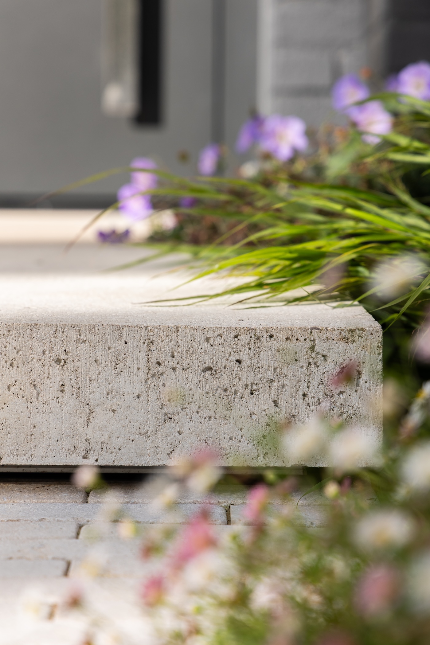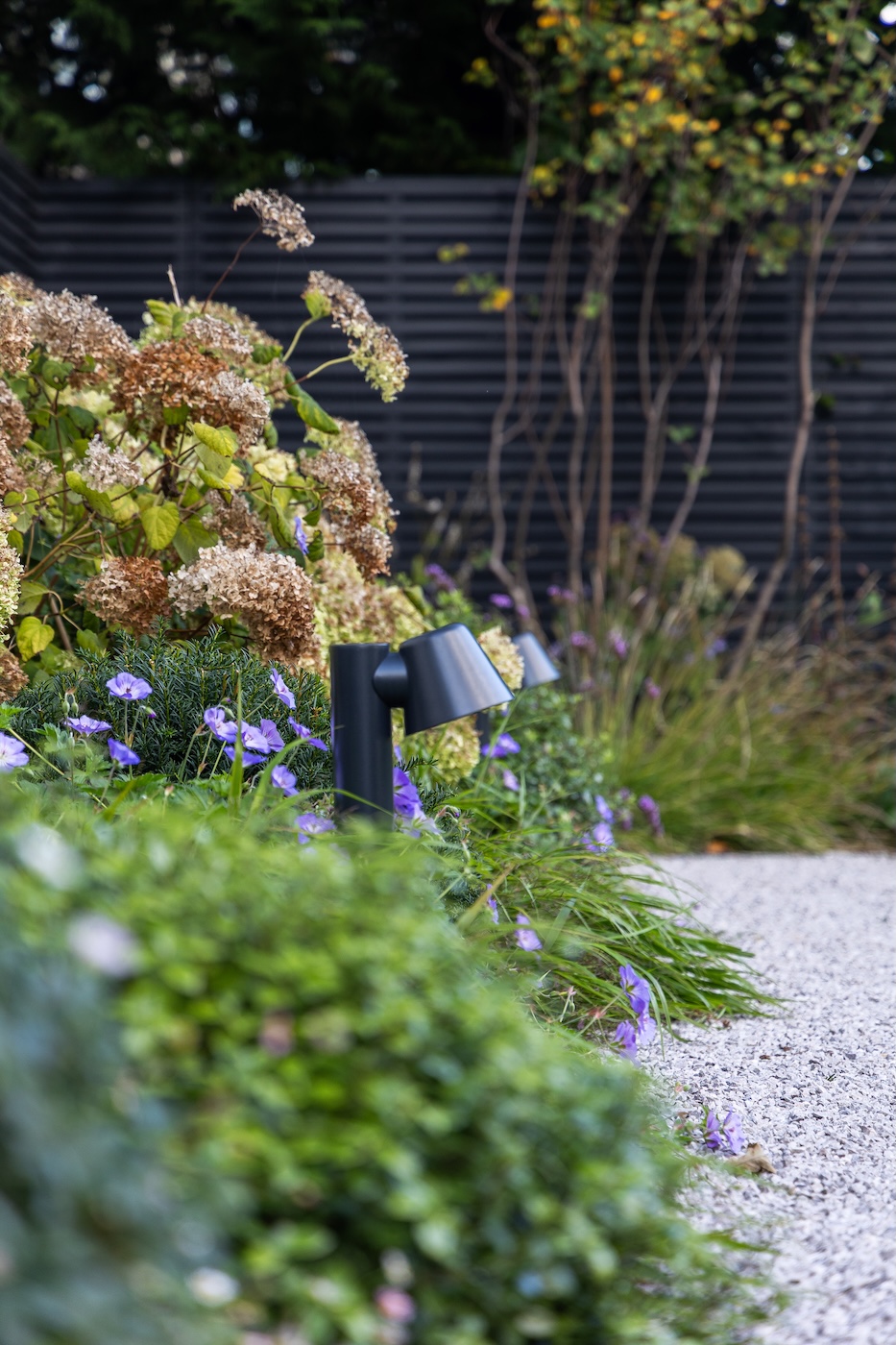 The front garden and driveway continue the theme whilst providing a striking approach to the property. Texture is added with the inclusion of gravel and stone pavers. A long path leads you to the floating step and front door, flanked by multistep trees which add drama and height interest.