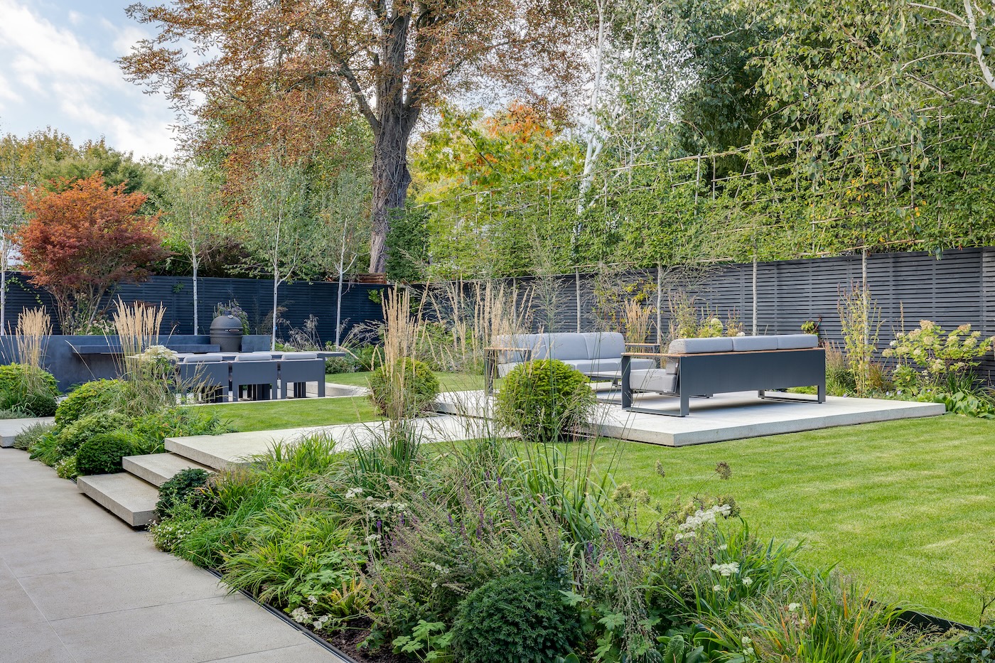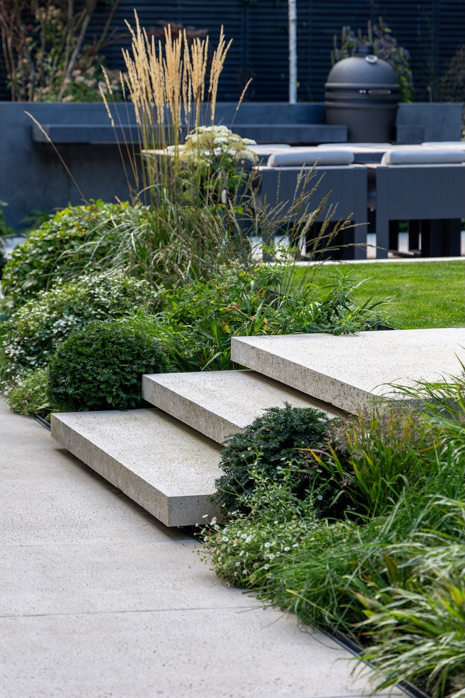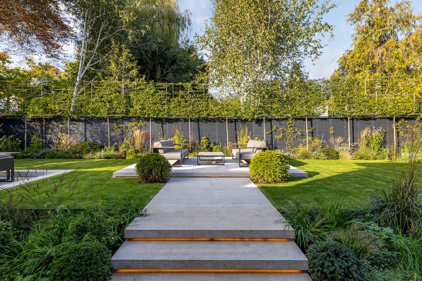 In the back garden we achieved this by using an uncomplicated material pallet and impactful site lines. Simple but effective concrete cantilevered steps provide a contemporary architectural feature that lead to a outdoor living room / terrace with luxurious sofas. Also by restricting the volume of hard landscaping and using a healthy balance of planting including pleached trees for privacy, the soft landscaping knits it all together nicely.
