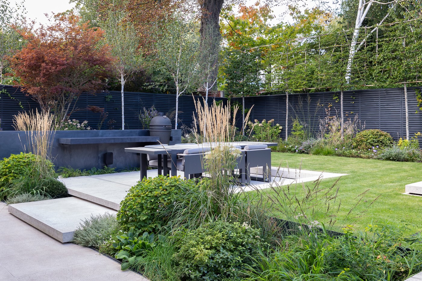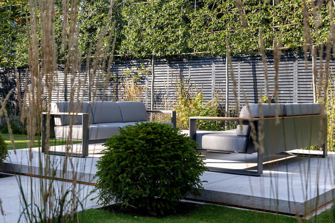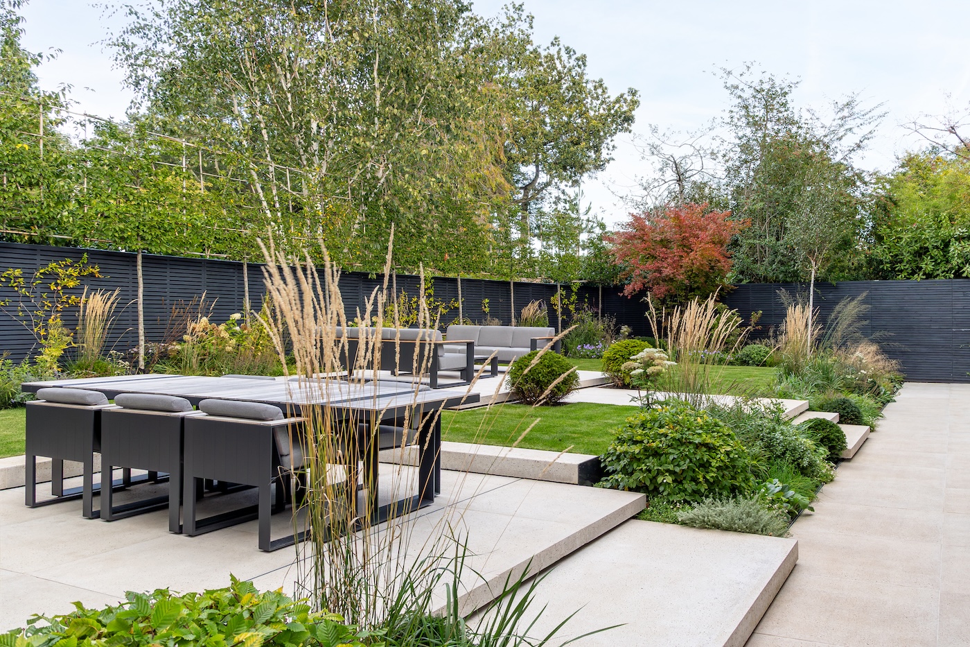 In the back garden we achieved this by using an uncomplicated material pallet and impactful site lines. Simple but effective concrete cantilevered steps provide a contemporary architectural feature that lead to a outdoor living room / terrace with luxurious sofas. Also by restricting the volume of hard landscaping and using a healthy balance of planting including pleached trees for privacy, the soft landscaping knits it all together nicely.