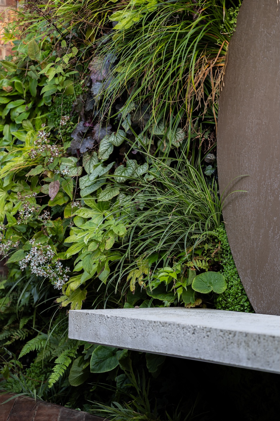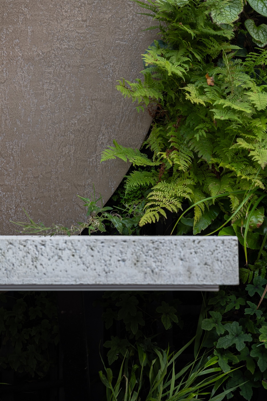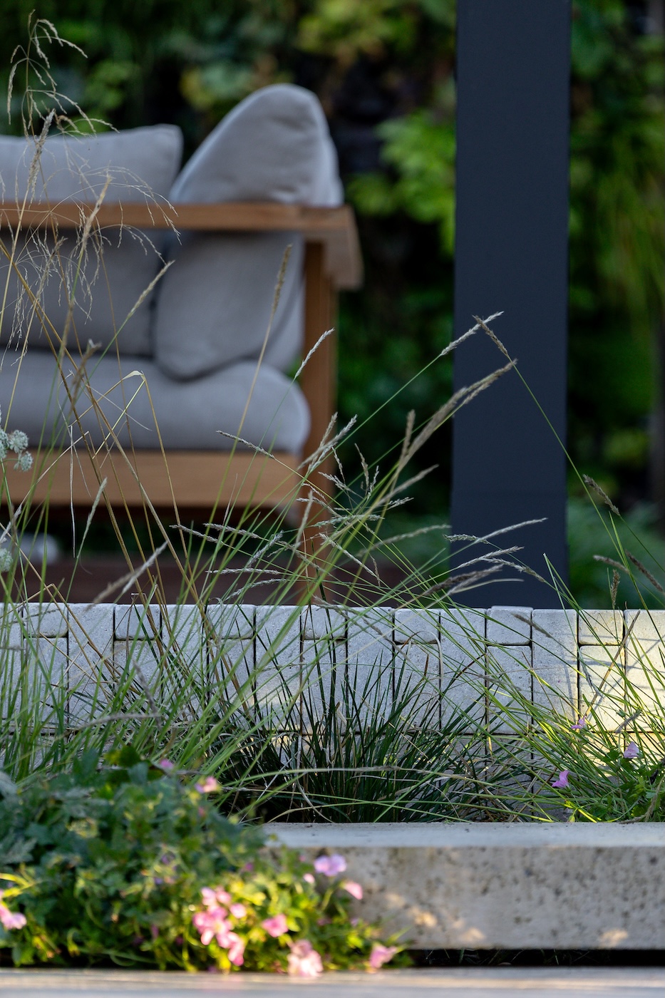 A series of floating concrete steps lead through lush planting beds onto a spacious lawn for the children to play. The contemporary urban planting scheme balances structure and softness with deep, textural borders that complement the hard landscaping and offer tranquil views from within the home. Specimen multi-stem trees and tree ferns provide height interest and architectural structure to the planting beds.