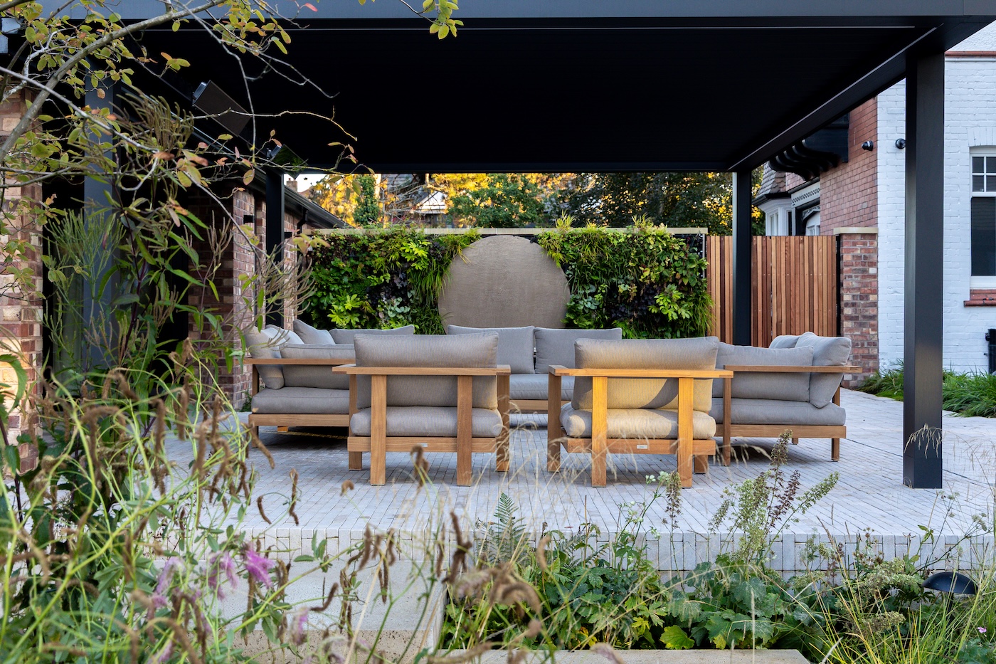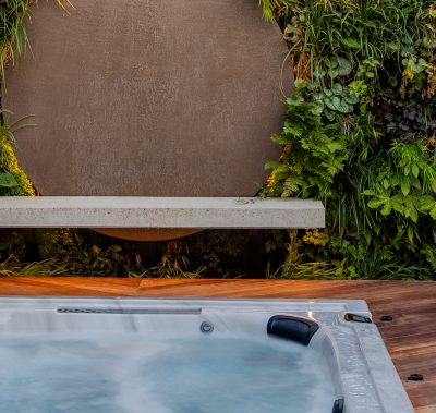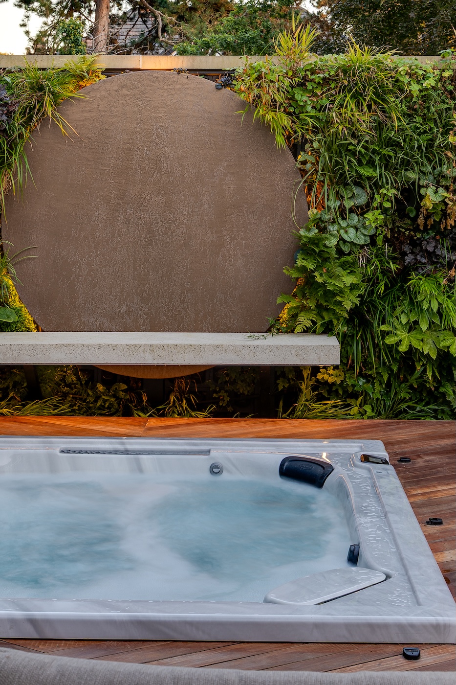 Elegant porcelain paving wraps around the property and seamlessly flows out from the interior to create a large multifunctional inside-out patio space. The layout feels open yet thoughtfully zoned, offering distinct areas for dining, relaxing, and entertaining. A built in outdoor kitchen sits under a luxury bespoke timber slat pergola and provides a relaxed space to gather, cook and socialise situated adjacent to the garden room. A second steel frame pergola defines a shaded outdoor living area with luxurious comfortable sofas. A Rivera c-side sunken spa with concrete and chevron deck surround sits below a dramatic feature wall which combines a cantilevered floating concrete bench, a liquid metal disc, and a lush green living wall for a bold, contemporary statement.