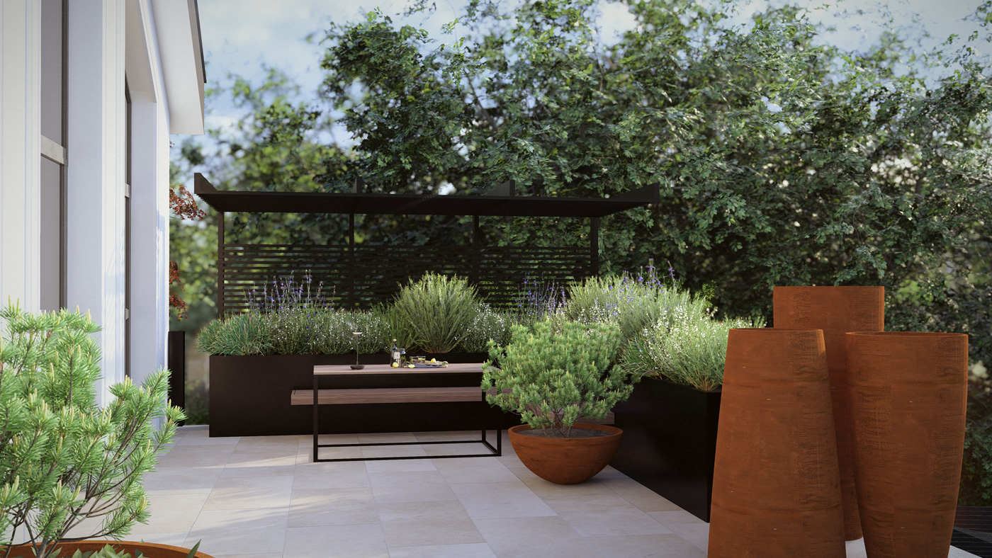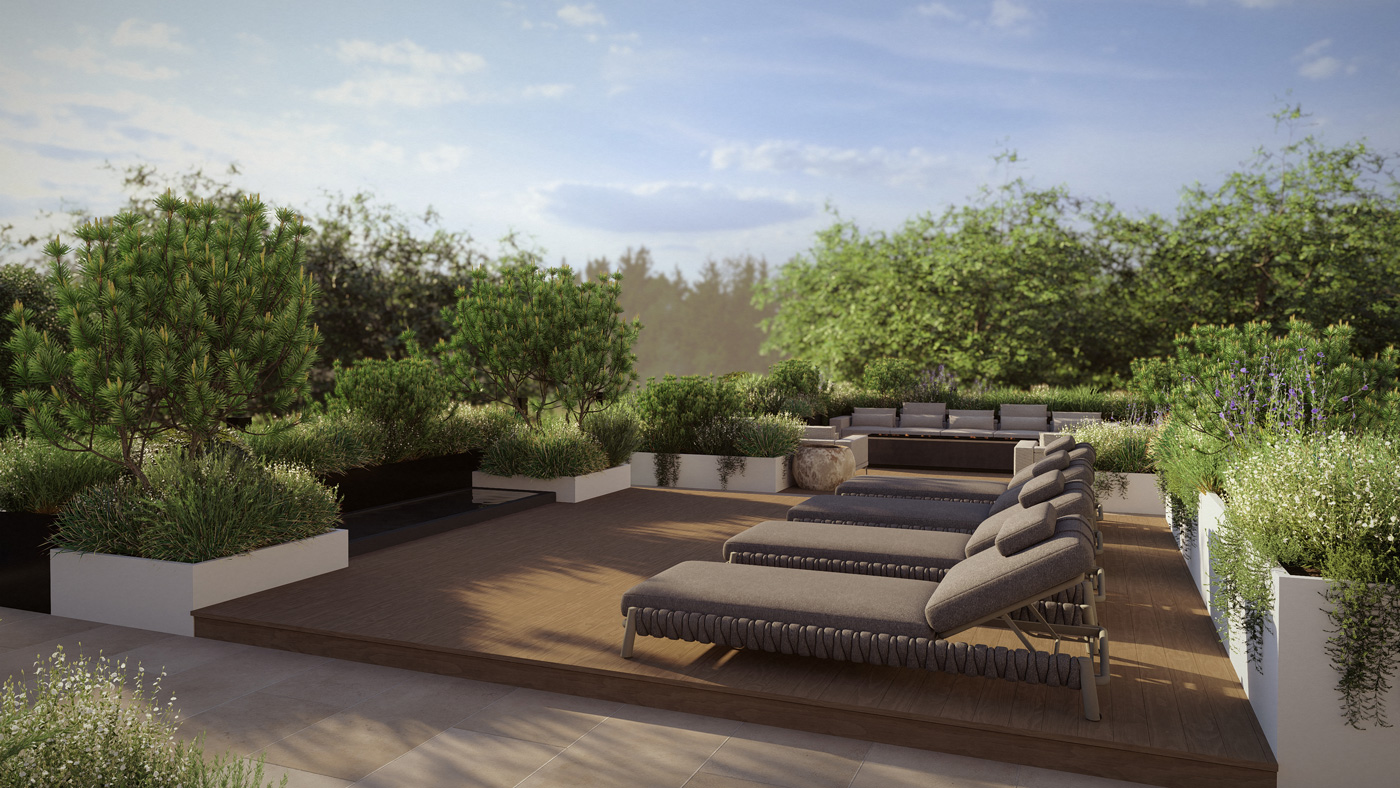 On the roof terrace, raised planters inject colour through planting and define a number of elegant garden rooms including a second outdoor living room, a relaxation terrace with loungers and an al fresco dining zone beneath a cantilevered pergola with a built-in bench.