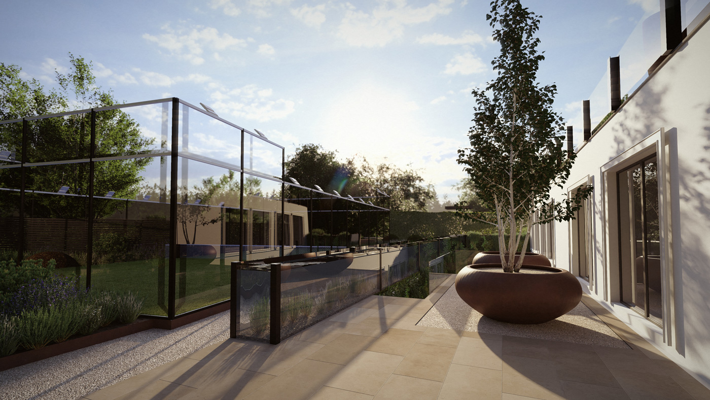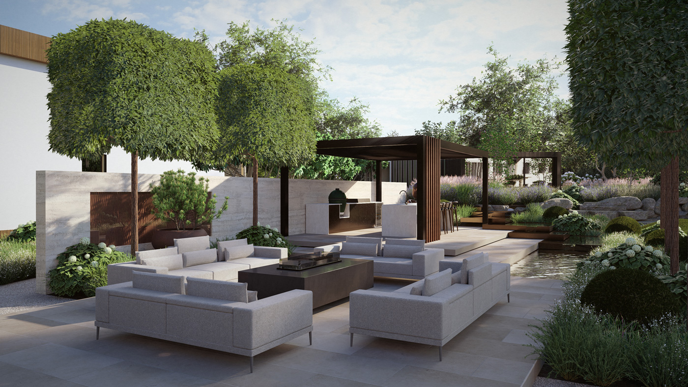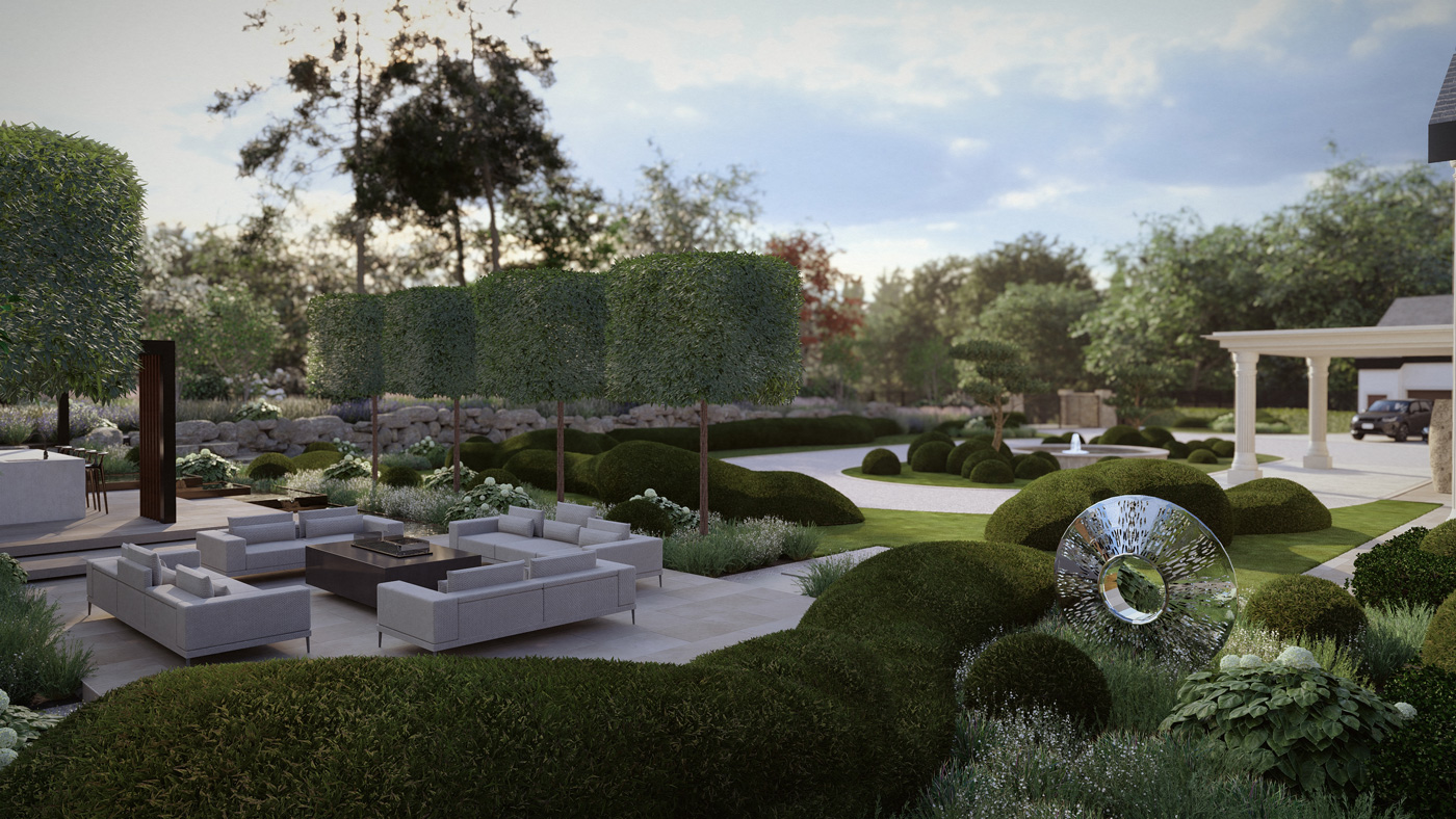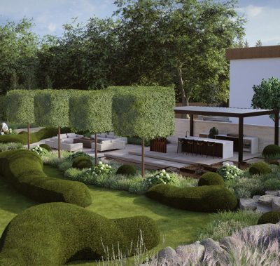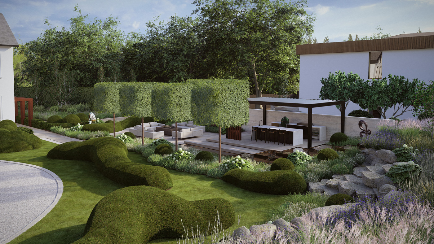 Bold architectural lines and sculptural topiary forms guides movement through the space whilst immersive outdoor living rooms create inviting environments for relaxing, dining, and entertaining.