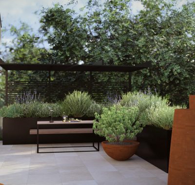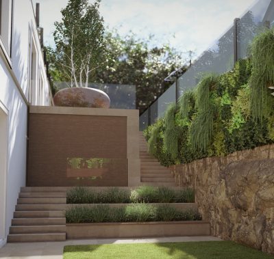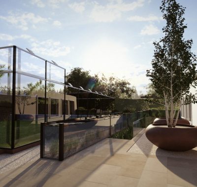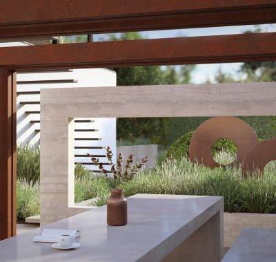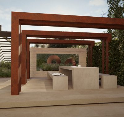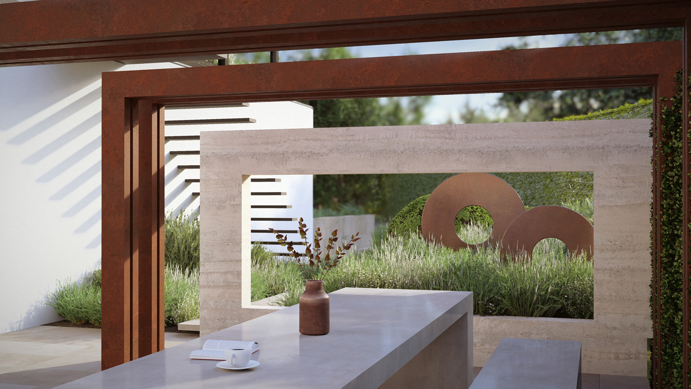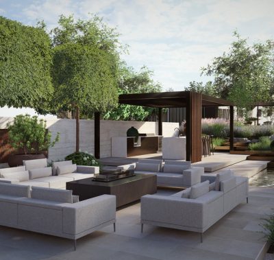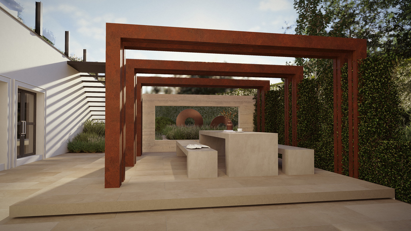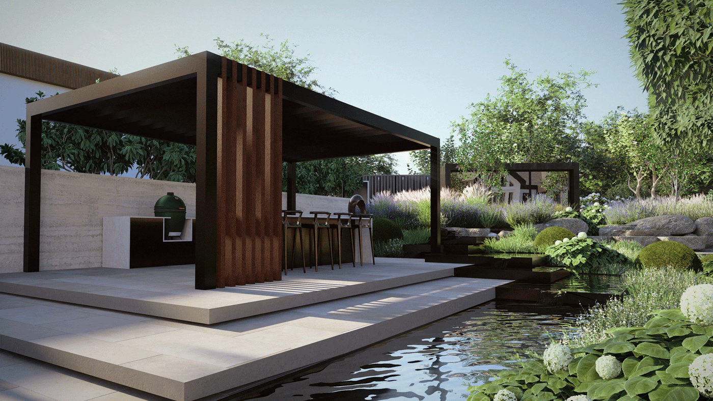 Bold architectural lines and sculptural topiary forms guides movement through the space whilst immersive outdoor living rooms create inviting environments for relaxing, dining, and entertaining.
