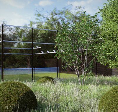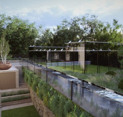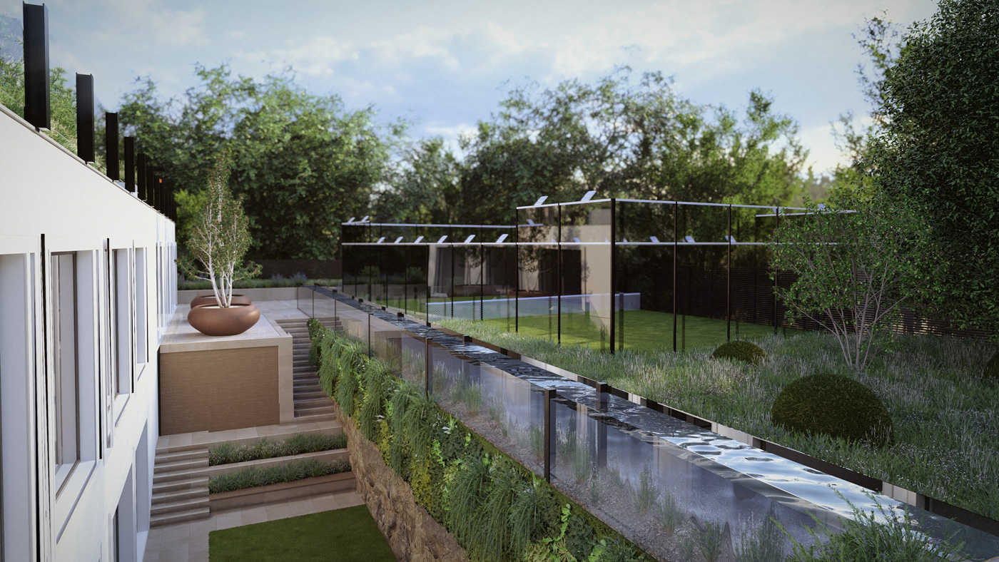 A private panel court is nestled into the rear along with a sub-terranean play area which also features a striking water feature and living wall.