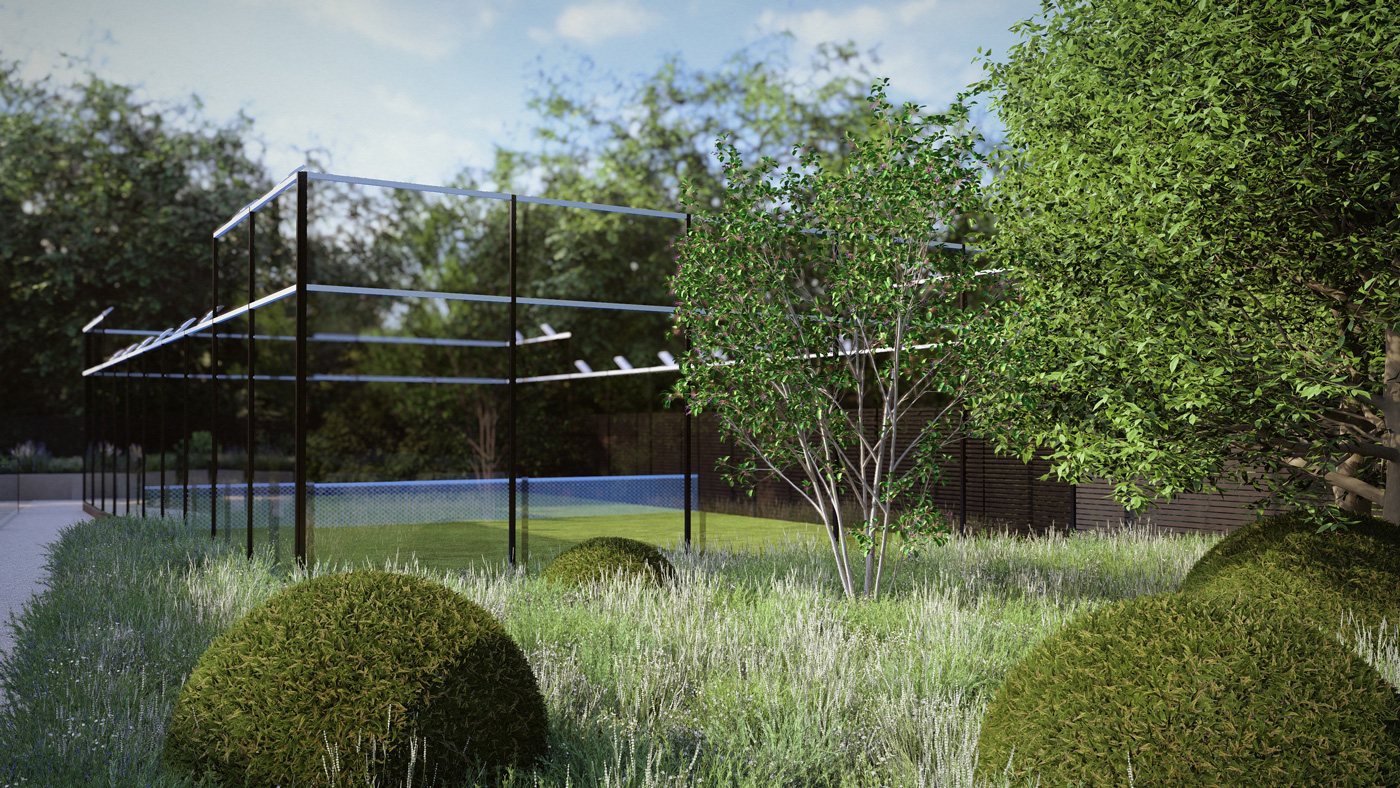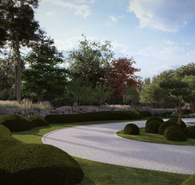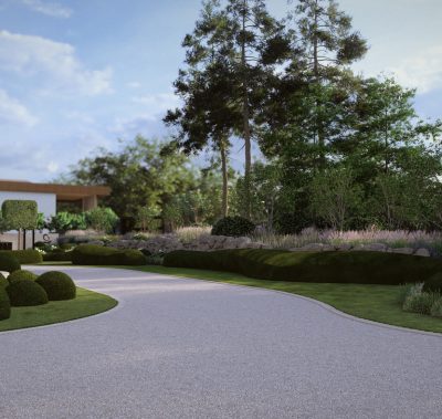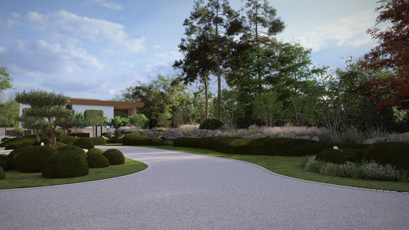 A bold, modern planting scheme compliments the hard landscaping with deep herbaceous borders, understorey woodland planting and naturalistic swathes of texture and colour. Sculptural cloud forms and clipped spheres bring structure, while multi-stem trees and specimen bonsai add drama, seasonal interest, and timeless character.