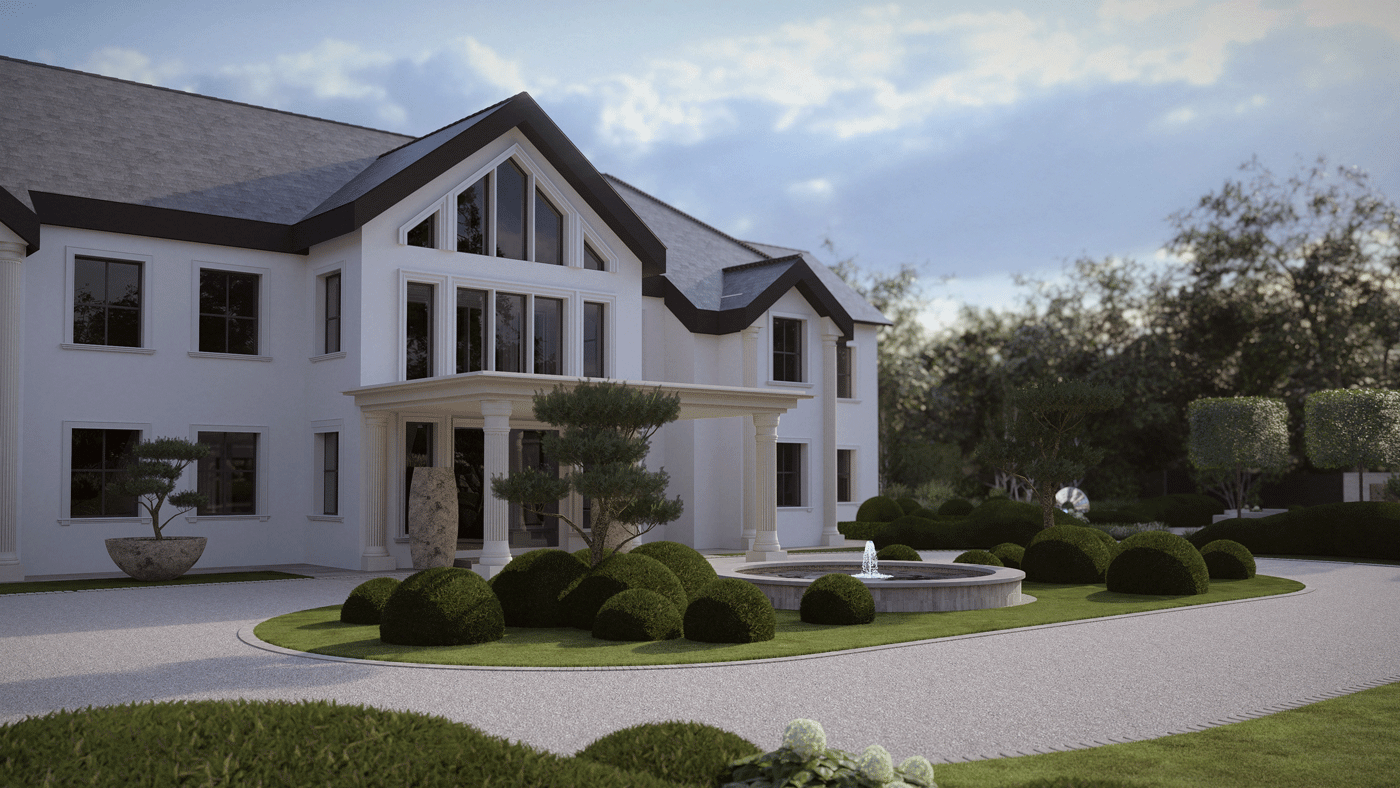 On arrival a sweeping circular driveway leads to the front door and under the shelter of the portico and wraps around a grand central water feature and fountain. Nearby a luxurious outdoor living area features elegant garden sofas that gather around a fire table and a bioclimatic pergola shelters an outdoor kitchen and dining space. A tiered steel water feature cascades through the garden, adding sound, movement, and a striking sculptural focal point.