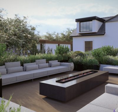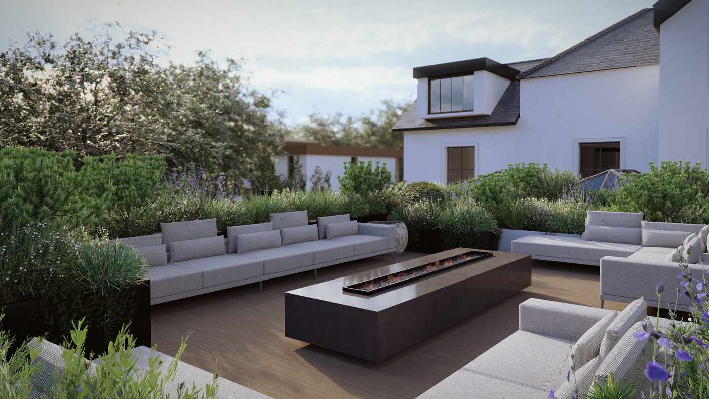 This contemporary garden wraps seamlessly around a stunning new build super home, creating a sequence of luxurious spaces that flow effortlessly from the interior and are integrated with the architecture and surrounding landscape.