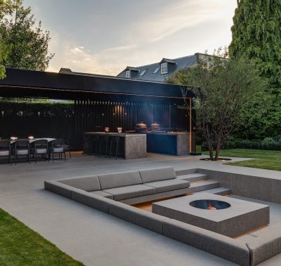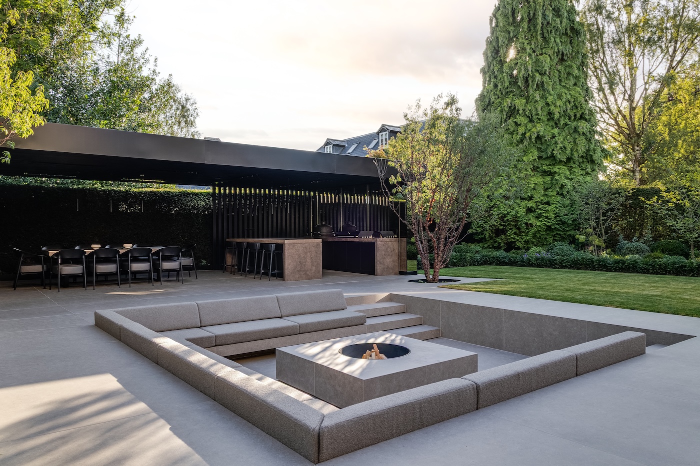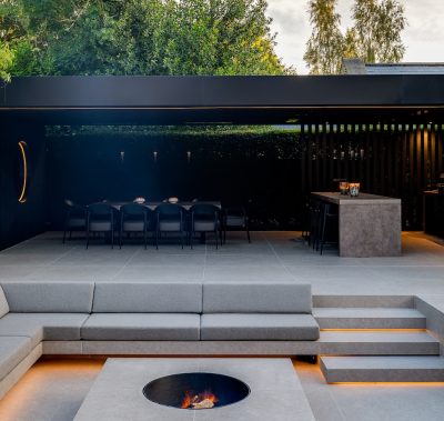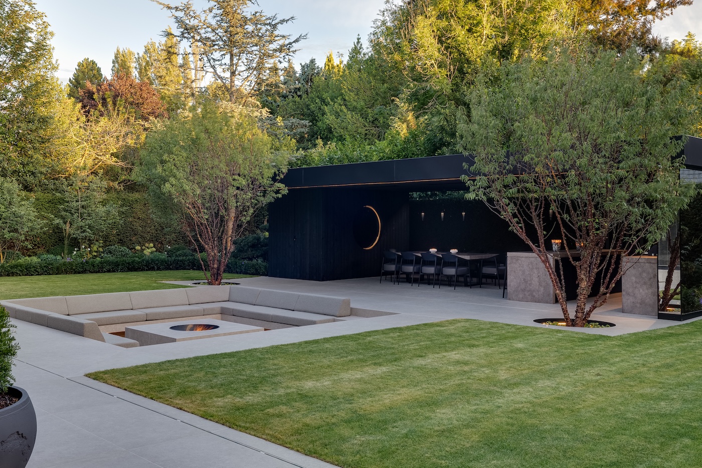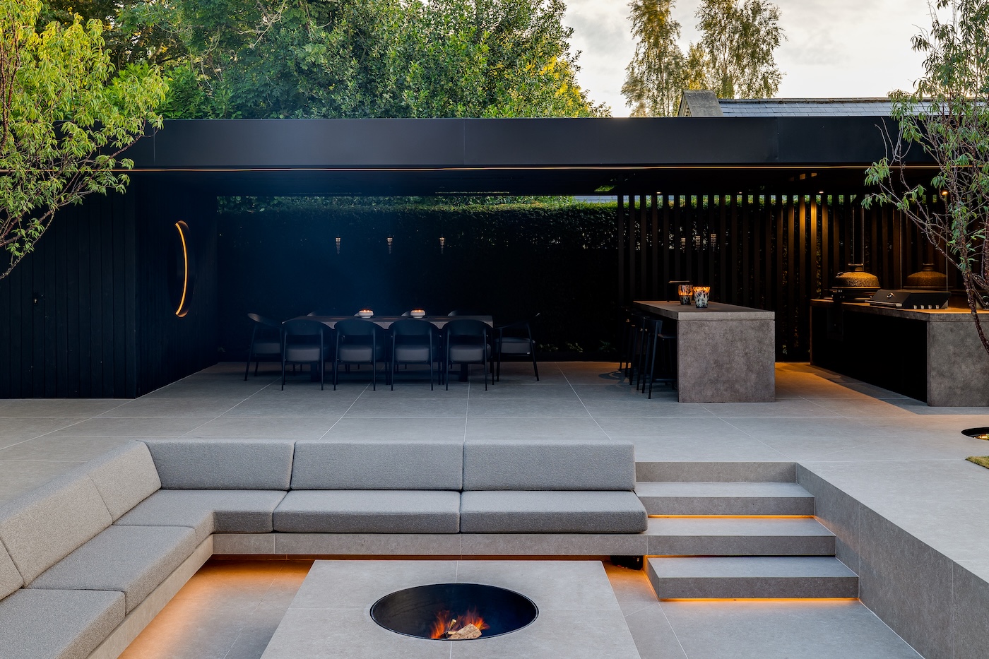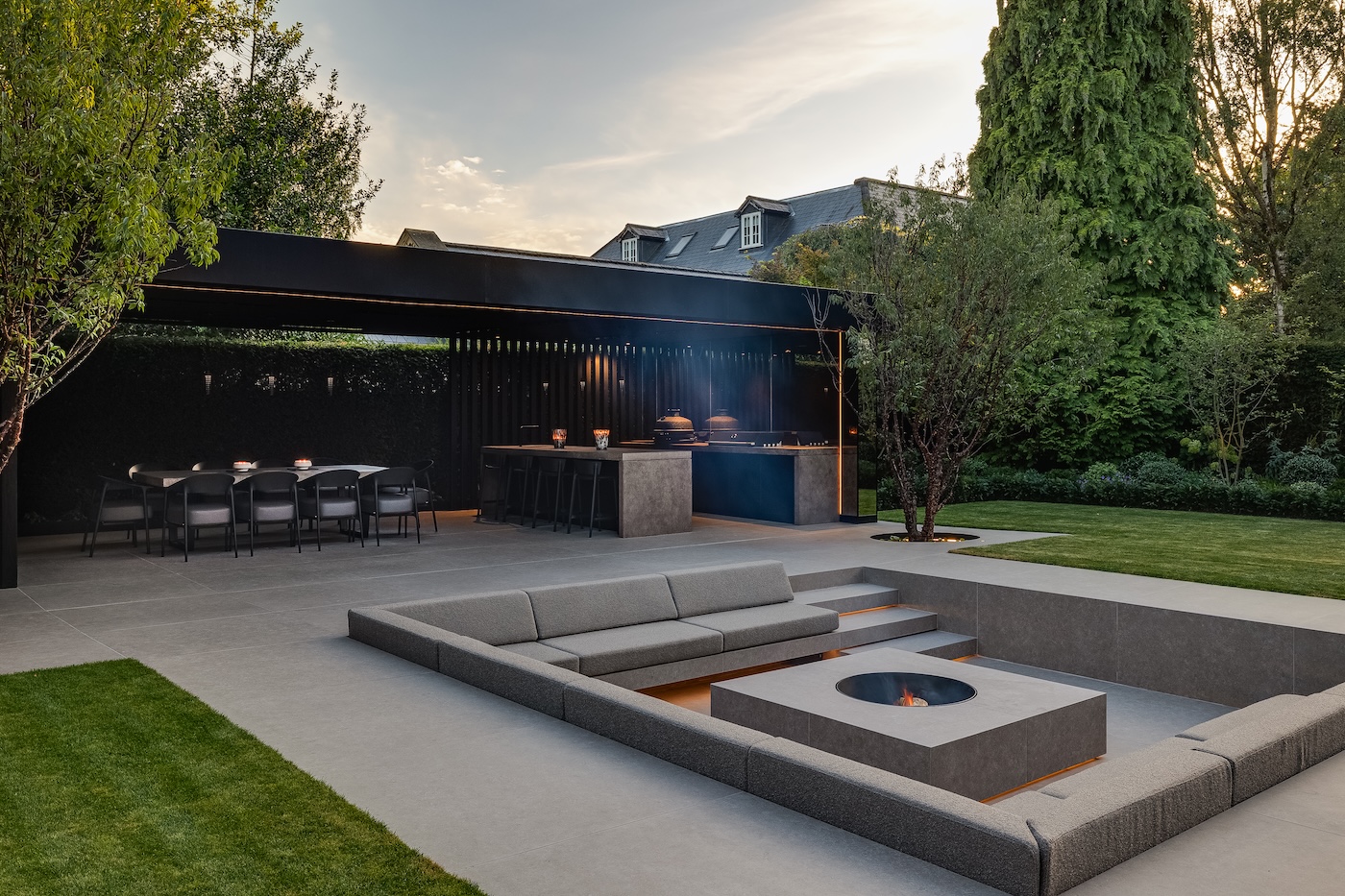 Our clients were looking for a Landscape Designer to create a garden that matched the level of elegant luxury they had achieved with the interior. The brief spoke of minimalism, clean lines and creating a wow factor. We achieved this by creating a seamless patio space which flows out through the kitchen diner bi-fold doors into a bespoke sunken seating area with cantilevered sofas and a bespoke concrete log burning fire table. Framing the garden and providing an opulent level of luxury, a stunning pavilion clad in charred timber houses an outdoor kitchen, dining and entertaining area. The patio in front of the pavilion features bespoke steel planter rings with multi stem trees to reflect a mirrored feature wall in the pavilion. Mood lighting creates a stylish and calming atmosphere with the use of variation of subtle lighting styles.