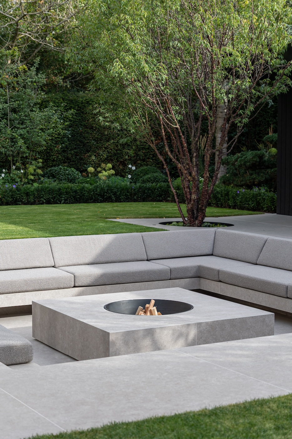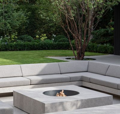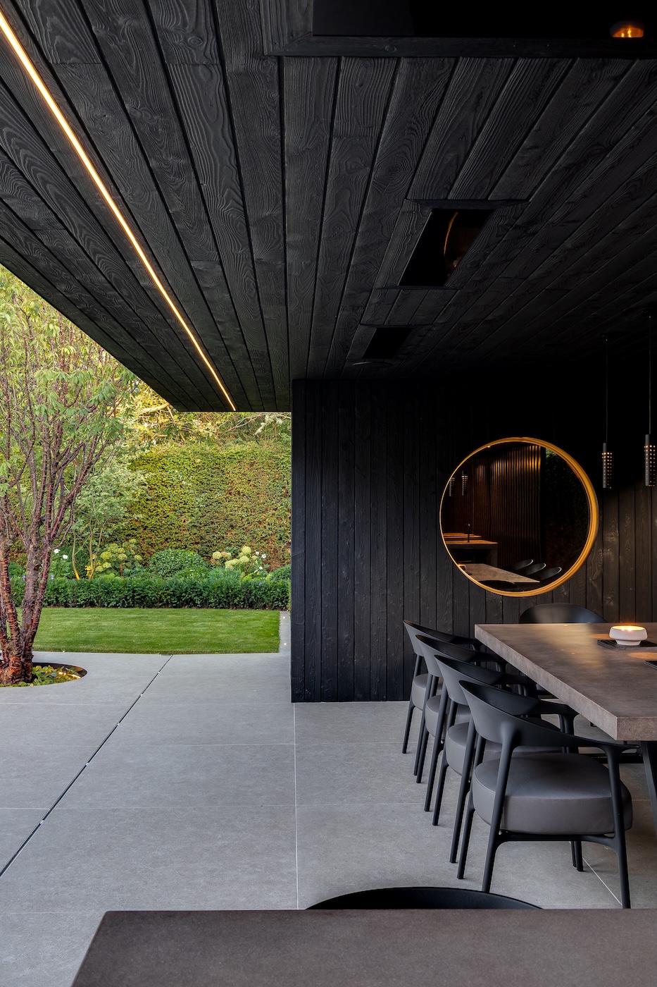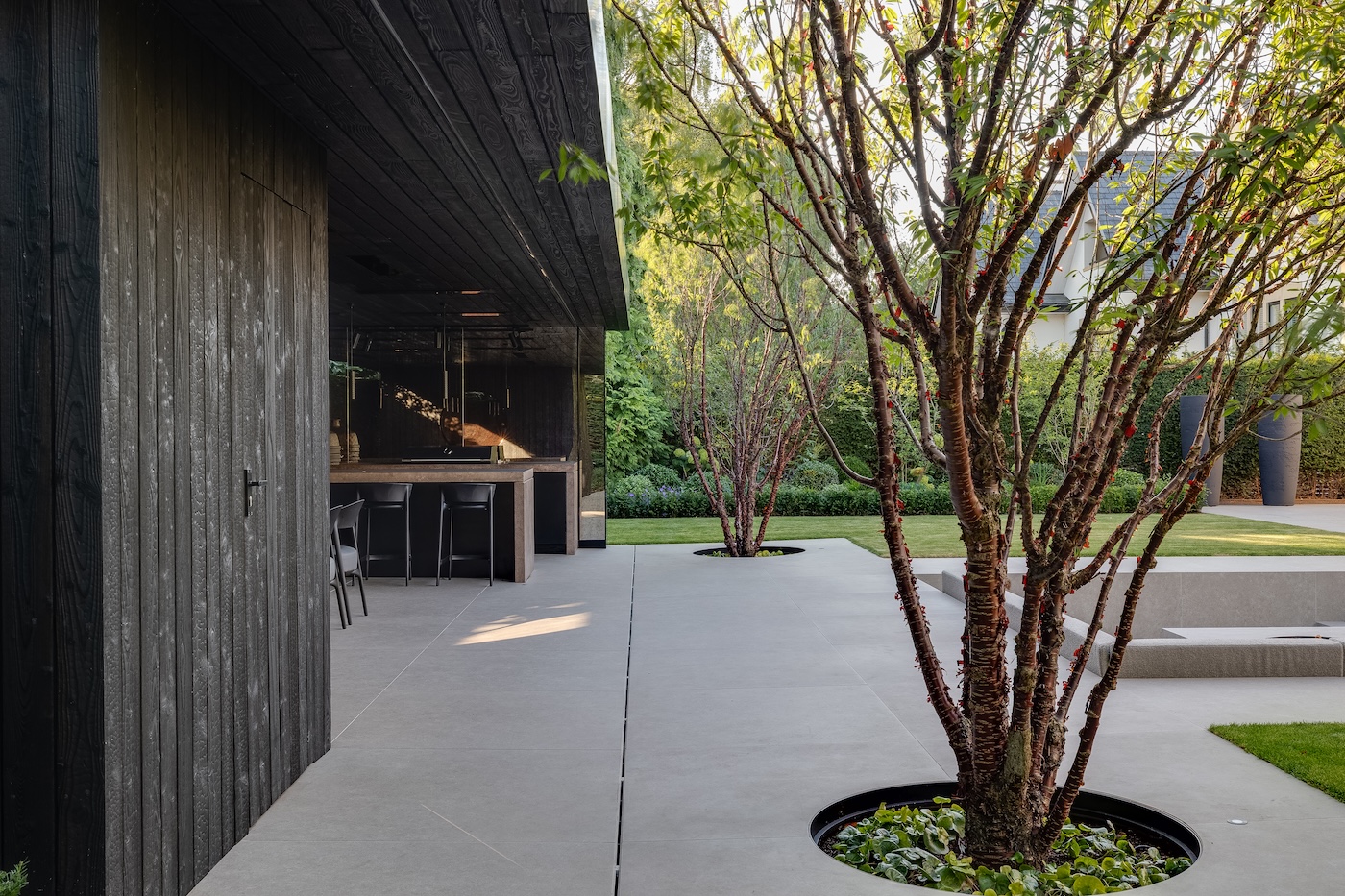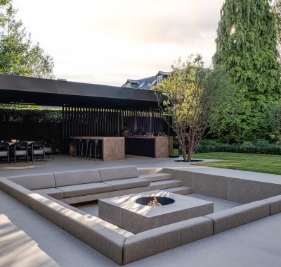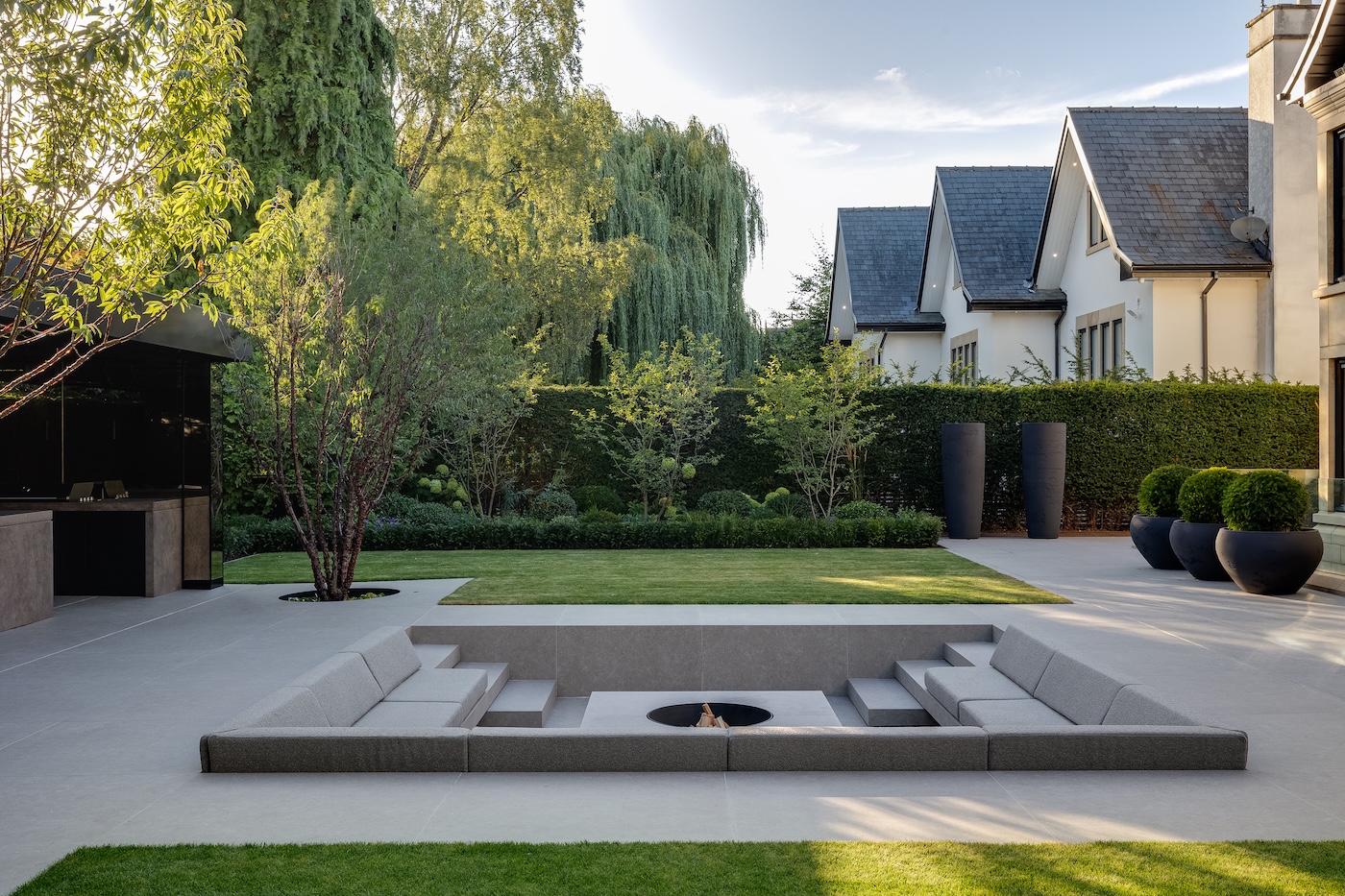 Our clients were looking for a Landscape Designer to create a garden that matched the level of elegant luxury they had achieved with the interior. The brief spoke of minimalism, clean lines and creating a wow factor. We achieved this by creating a seamless patio space which flows out through the kitchen diner bi-fold doors into a bespoke sunken seating area with cantilevered sofas and a bespoke concrete log burning fire table. Framing the garden and providing an opulent level of luxury, a stunning pavilion clad in charred timber houses an outdoor kitchen, dining and entertaining area. The patio in front of the pavilion features bespoke steel planter rings with multi stem trees to reflect a mirrored feature wall in the pavilion. Mood lighting creates a stylish and calming atmosphere with the use of variation of subtle lighting styles.