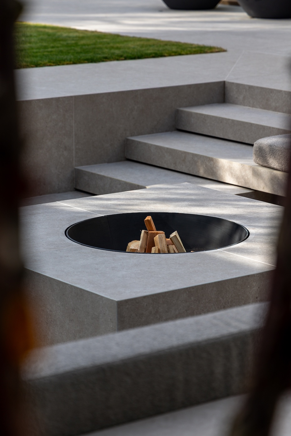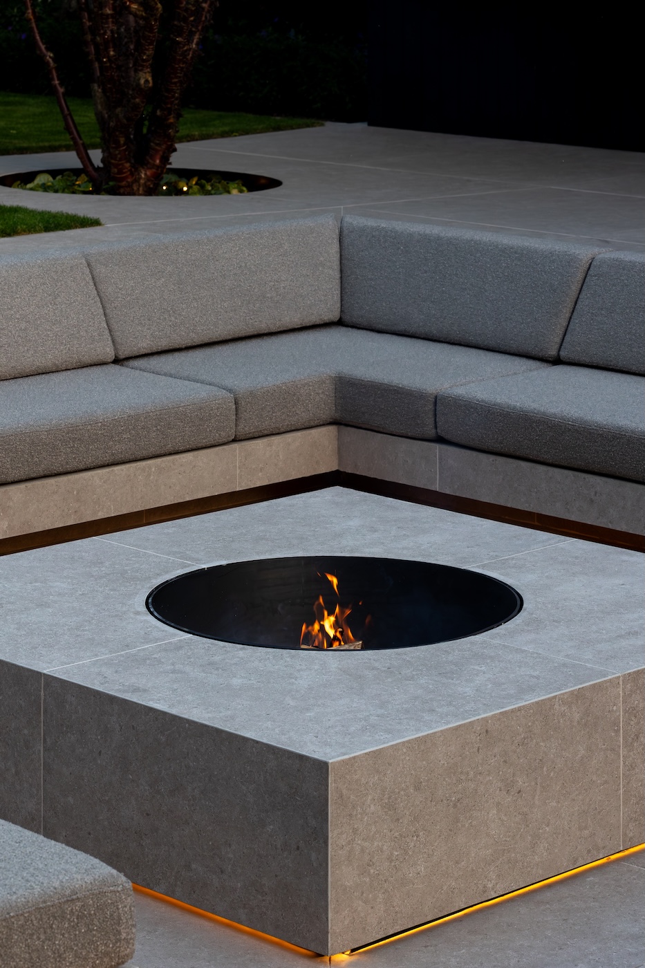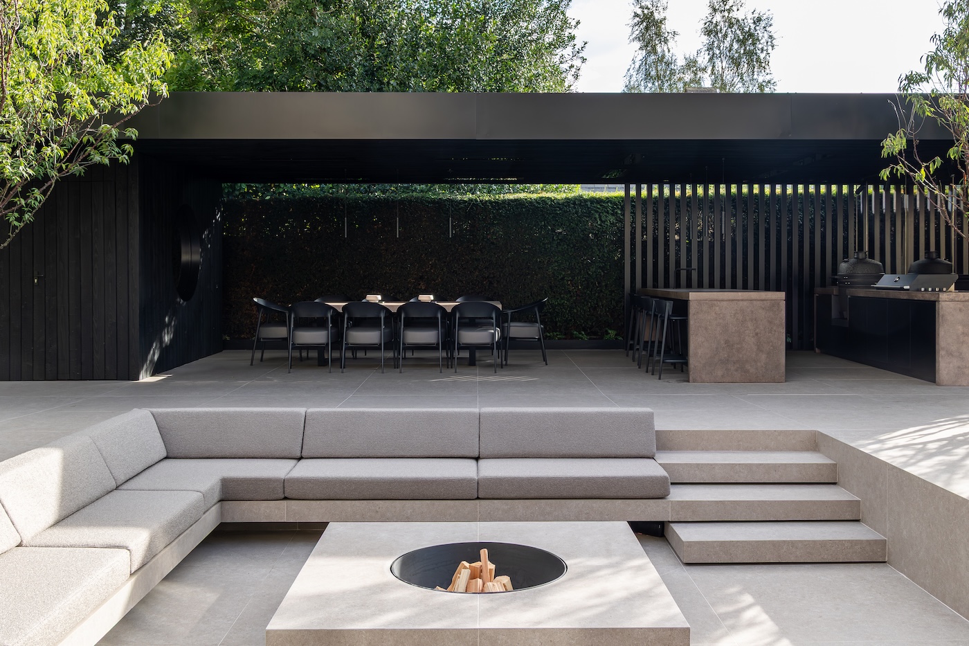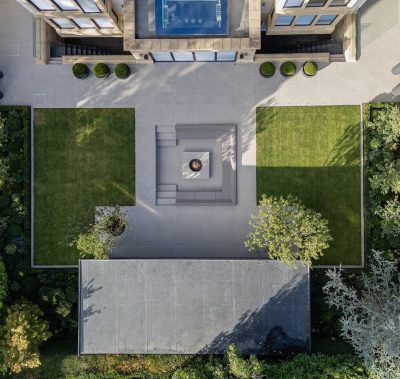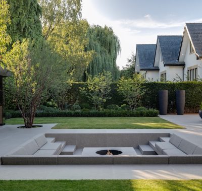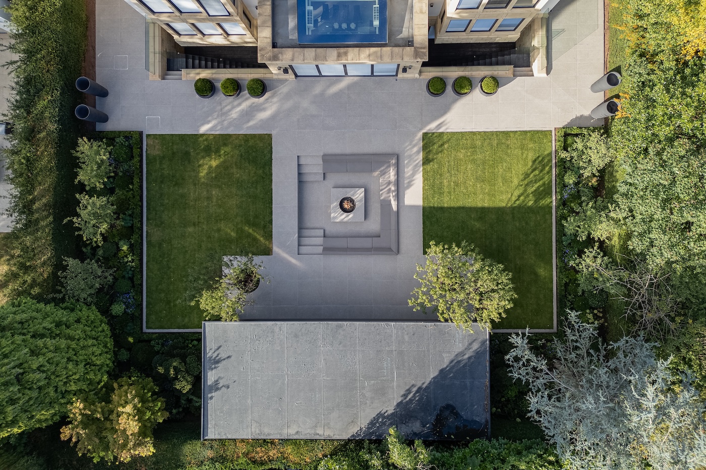 Our clients were looking for a Landscape Designer to create a garden that matched the level of elegant luxury they had achieved with the interior. The brief spoke of minimalism, clean lines and creating a wow factor. We achieved this by creating a seamless patio space which flows out through the kitchen diner bi-fold doors into a bespoke sunken seating area with cantilevered sofas and a bespoke concrete log burning fire table. Framing the garden and providing an opulent level of luxury, a stunning pavilion clad in charred timber houses an outdoor kitchen, dining and entertaining area. The patio in front of the pavilion features bespoke steel planter rings with multi stem trees to reflect a mirrored feature wall in the pavilion. Mood lighting creates a stylish and calming atmosphere with the use of variation of subtle lighting styles.