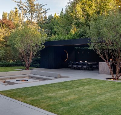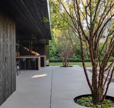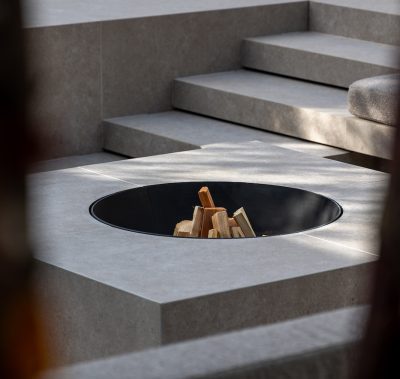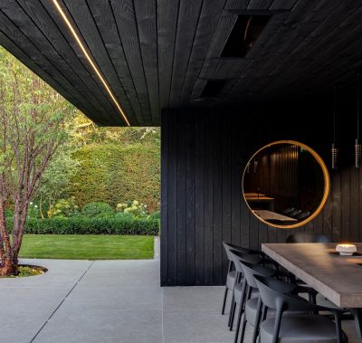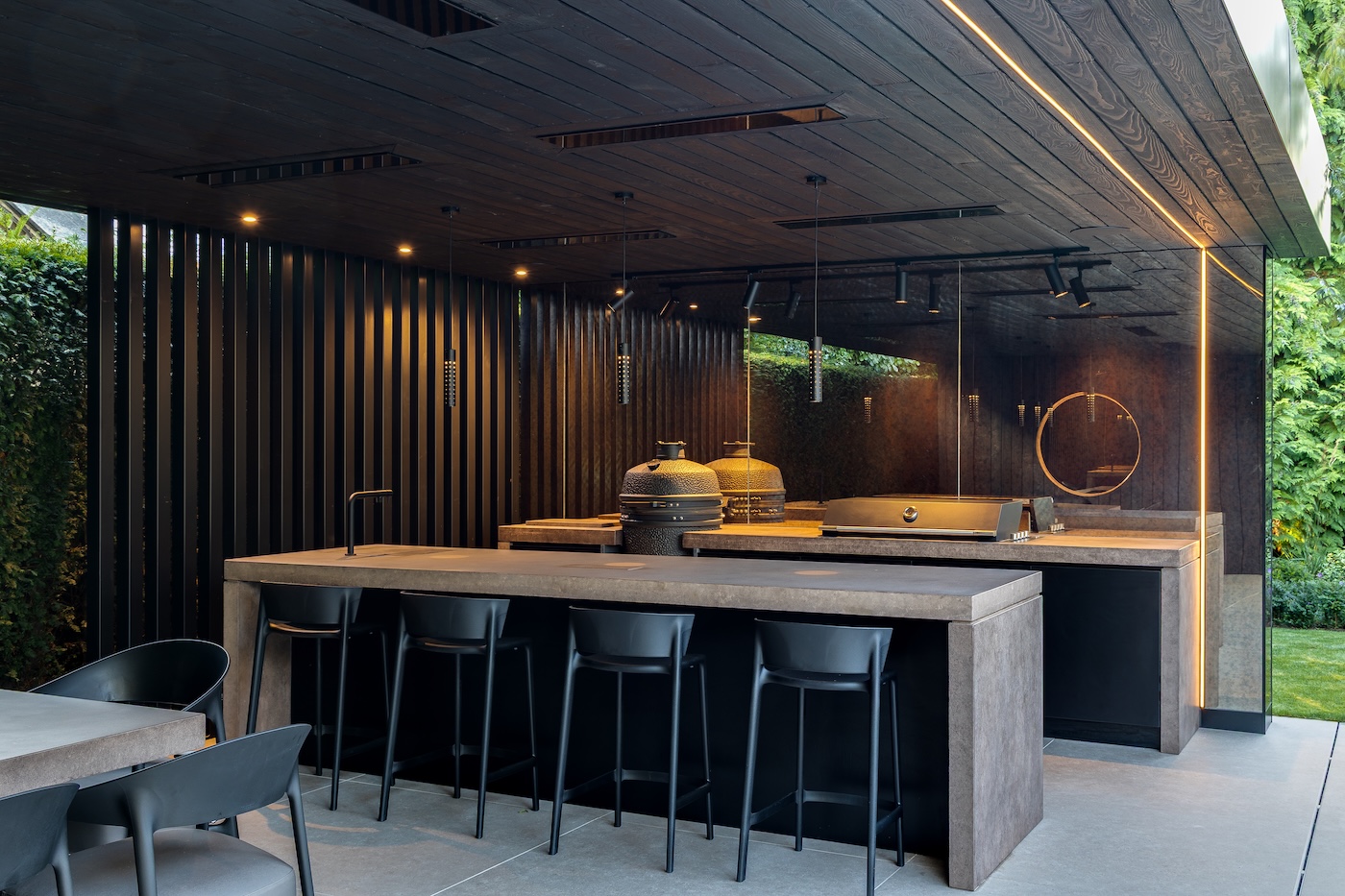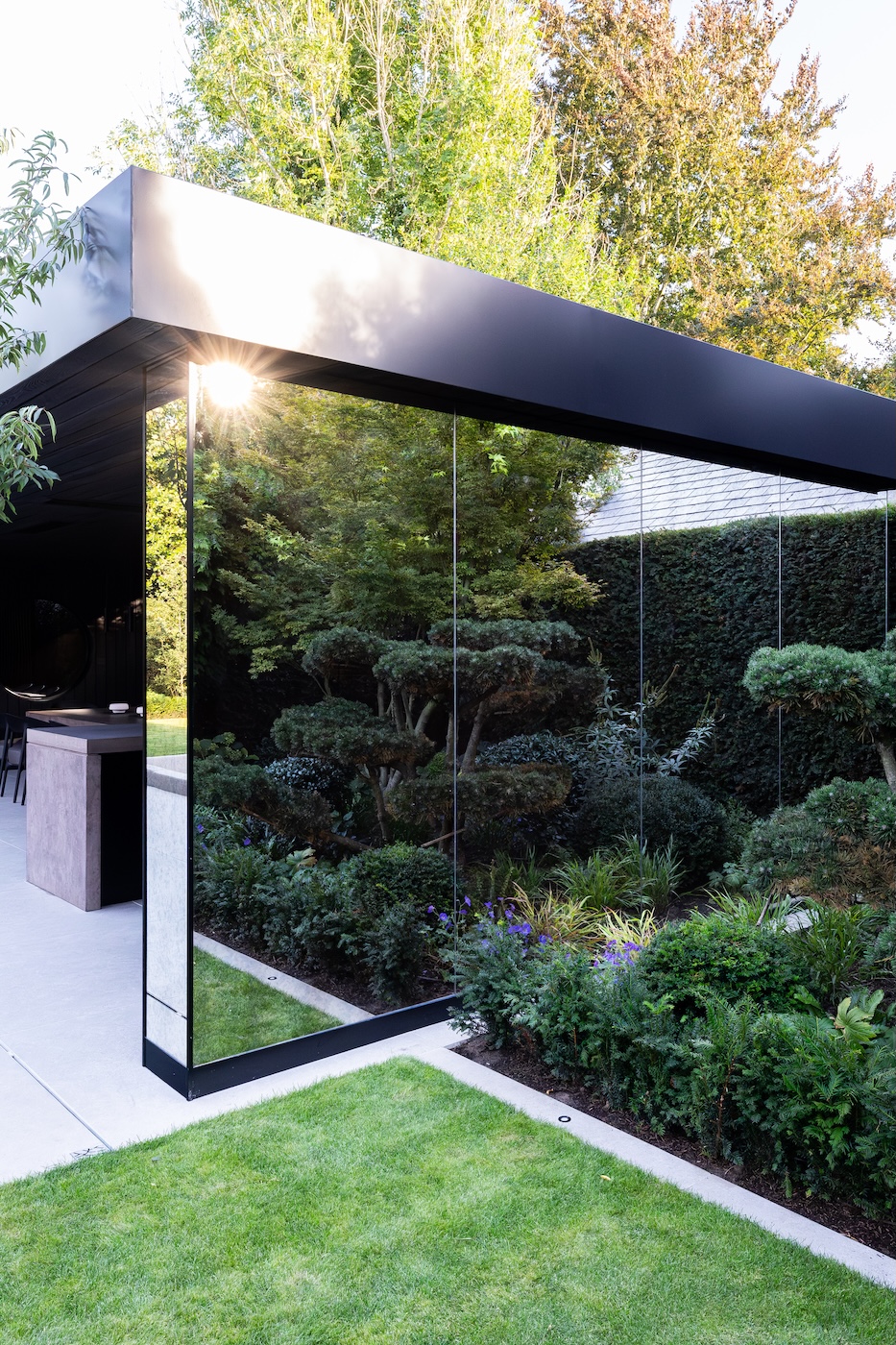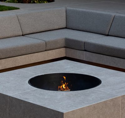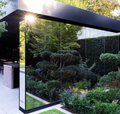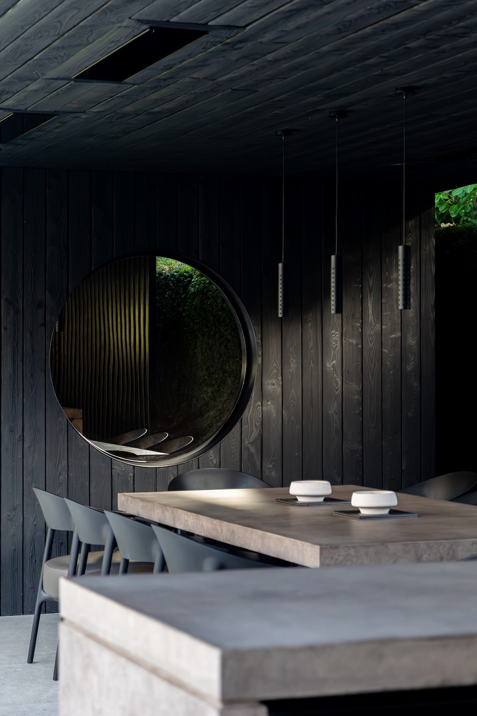Our clients were looking for a Landscape Designer to create a garden that matched the level of elegant luxury they had achieved with the interior. The brief spoke of minimalism, clean lines and creating a wow factor. We achieved this by creating a seamless patio space which flows out through the kitchen diner bi-fold doors into a bespoke sunken seating area with cantilevered sofas and a bespoke concrete log burning fire table. Framing the garden and providing an opulent level of luxury, a stunning pavilion clad in charred timber houses an outdoor kitchen, dining and entertaining area. The patio in front of the pavilion features bespoke steel planter rings with multi stem trees to reflect a mirrored feature wall in the pavilion. Mood lighting creates a stylish and calming atmosphere with the use of variation of subtle lighting styles.