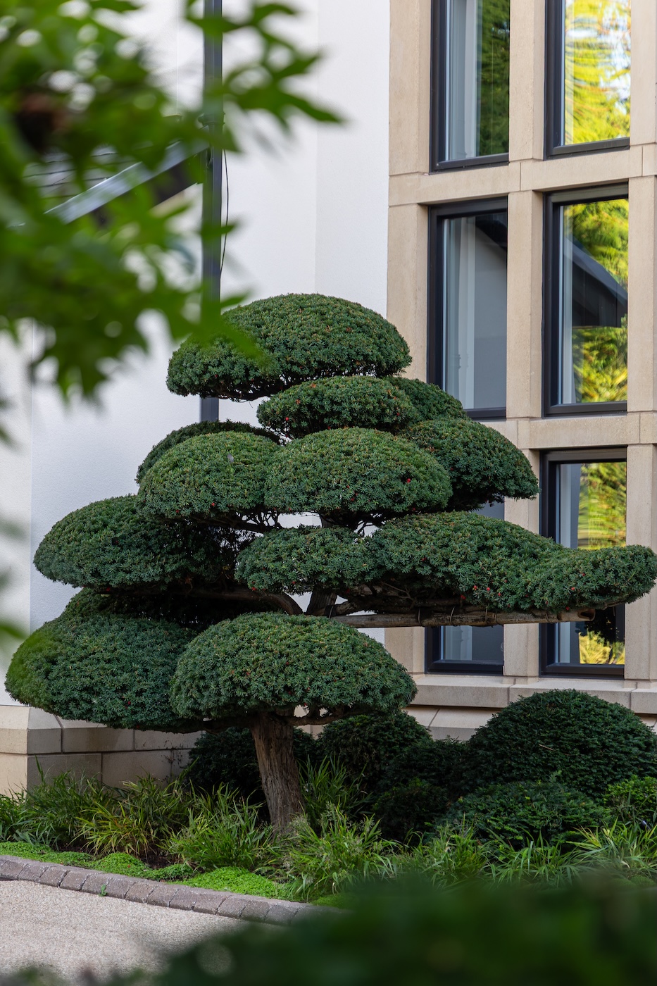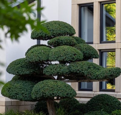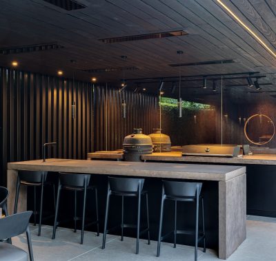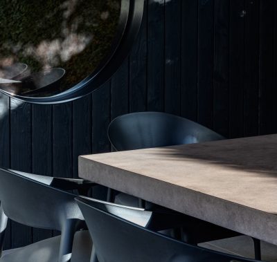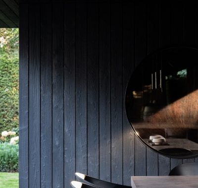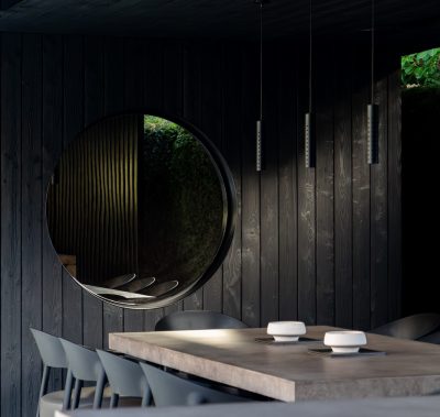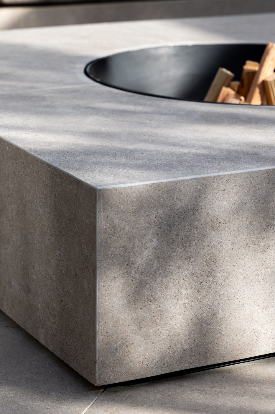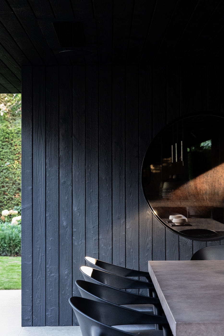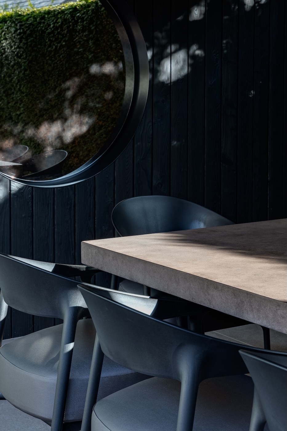 Our clients were looking for a Landscape Designer to create a garden that matched the level of elegant luxury they had achieved with the interior. The brief spoke of minimalism, clean lines and creating a wow factor. We achieved this by creating a seamless patio space which flows out through the kitchen diner bi-fold doors into a bespoke sunken seating area with cantilevered sofas and a bespoke concrete log burning fire table. Framing the garden and providing an opulent level of luxury, a stunning pavilion clad in charred timber houses an outdoor kitchen, dining and entertaining area. The patio in front of the pavilion features bespoke steel planter rings with multi stem trees to reflect a mirrored feature wall in the pavilion. Mood lighting creates a stylish and calming atmosphere with the use of variation of subtle lighting styles.